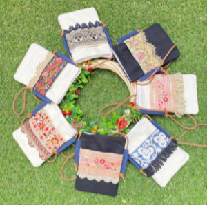 インド刺繍リボン、帆布生地を使ったカバンやポーチを作っています。リバティを使ったファブリックリースも2023 年登場!プレゼントにもご好評いただいています。